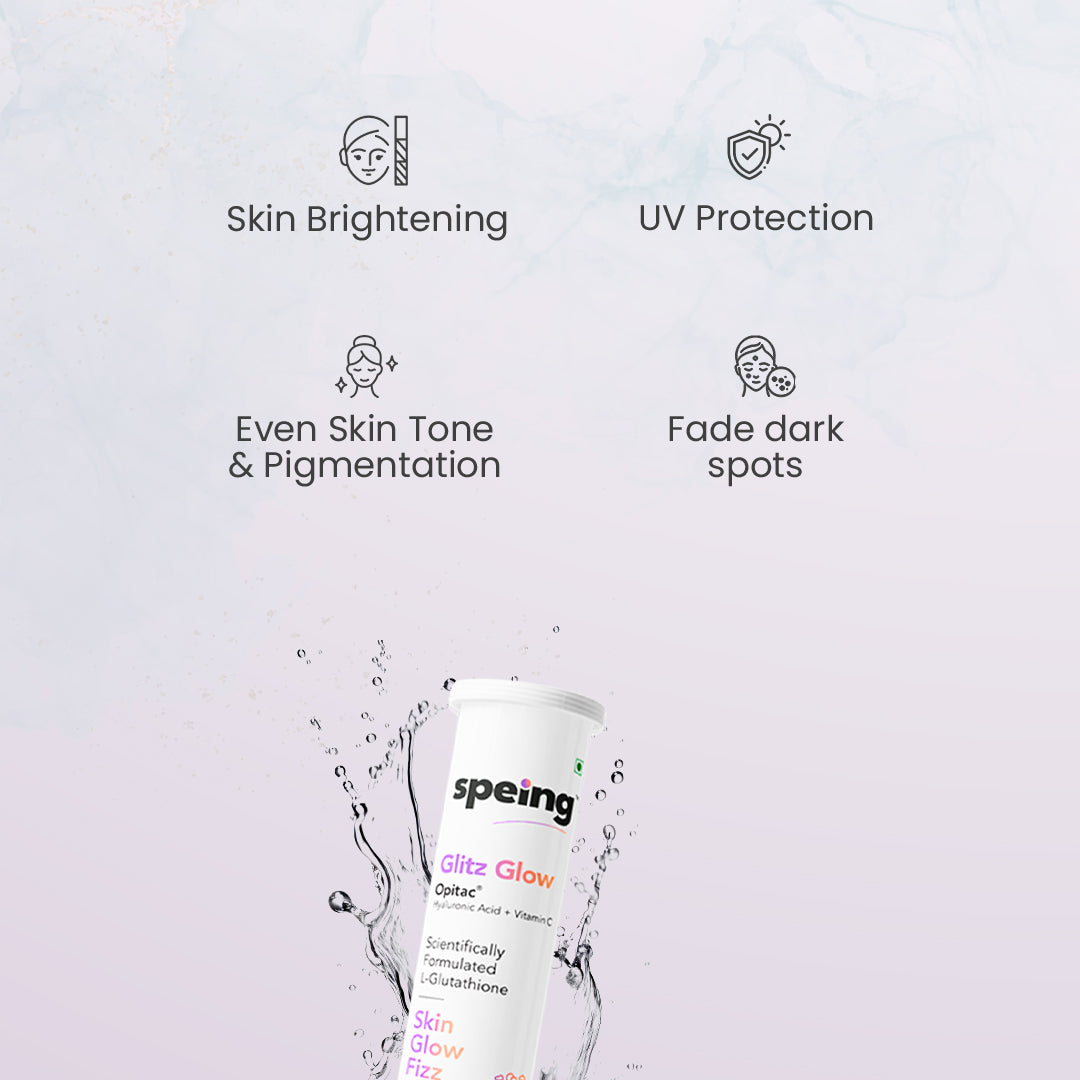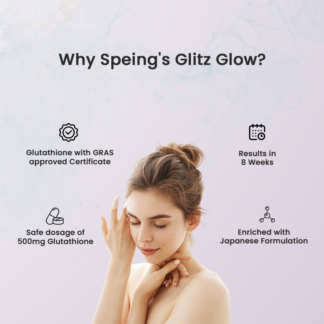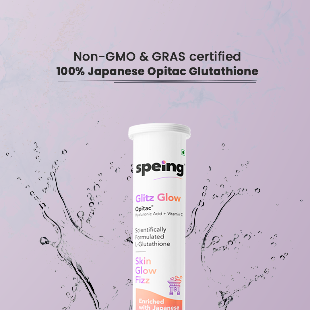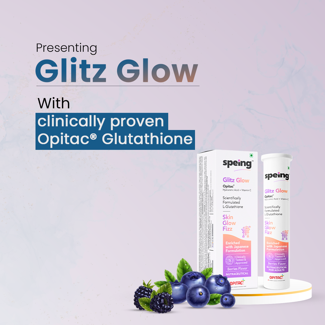 Speing Glitz Glow is a premium glutathione supplement designed to enhance skin radiance from within. It combines clinically proven Opitac® Glutathione with Hyaluronic Acid and Vitamin C to promote a brighter, more even complexion, reduce pigmentation, and protect against oxidative stress.