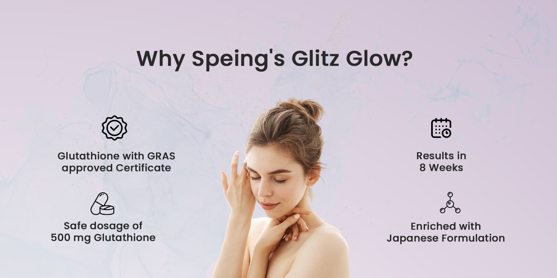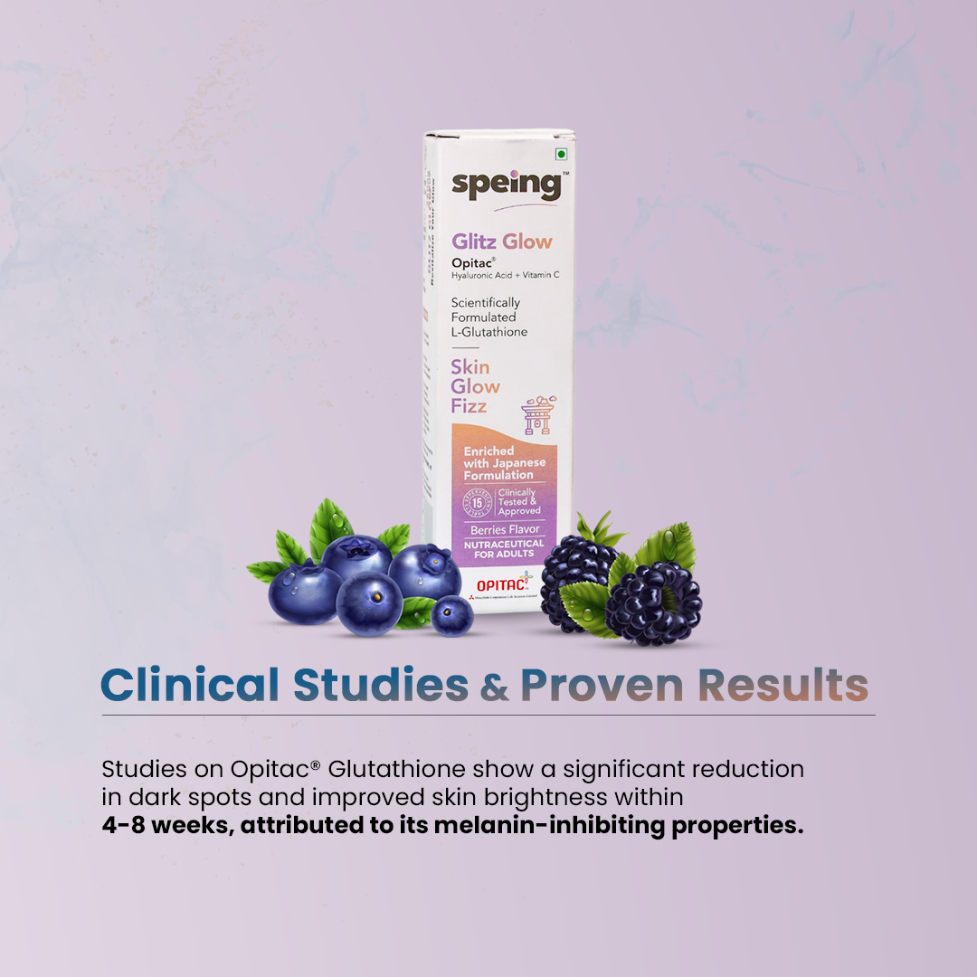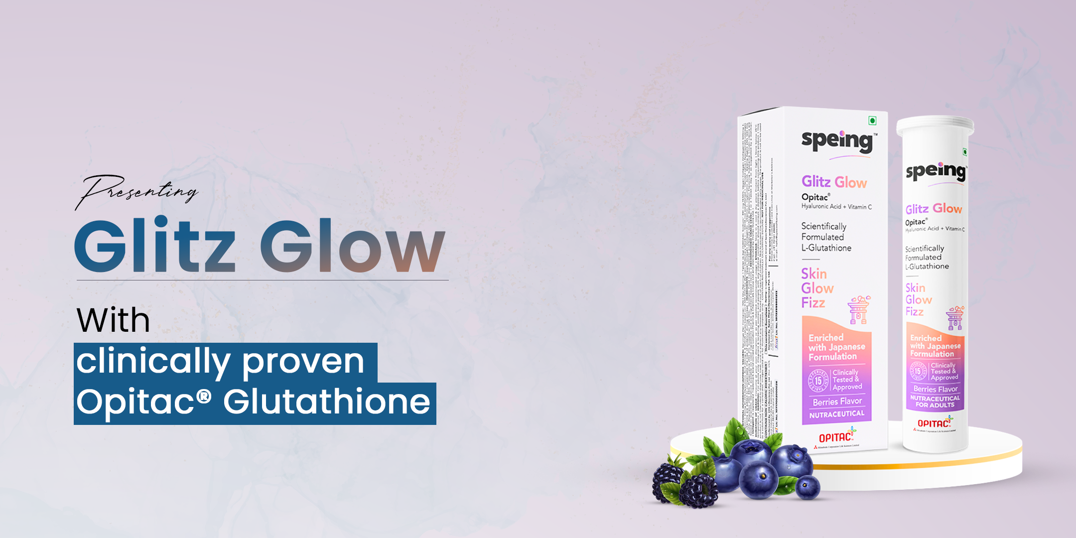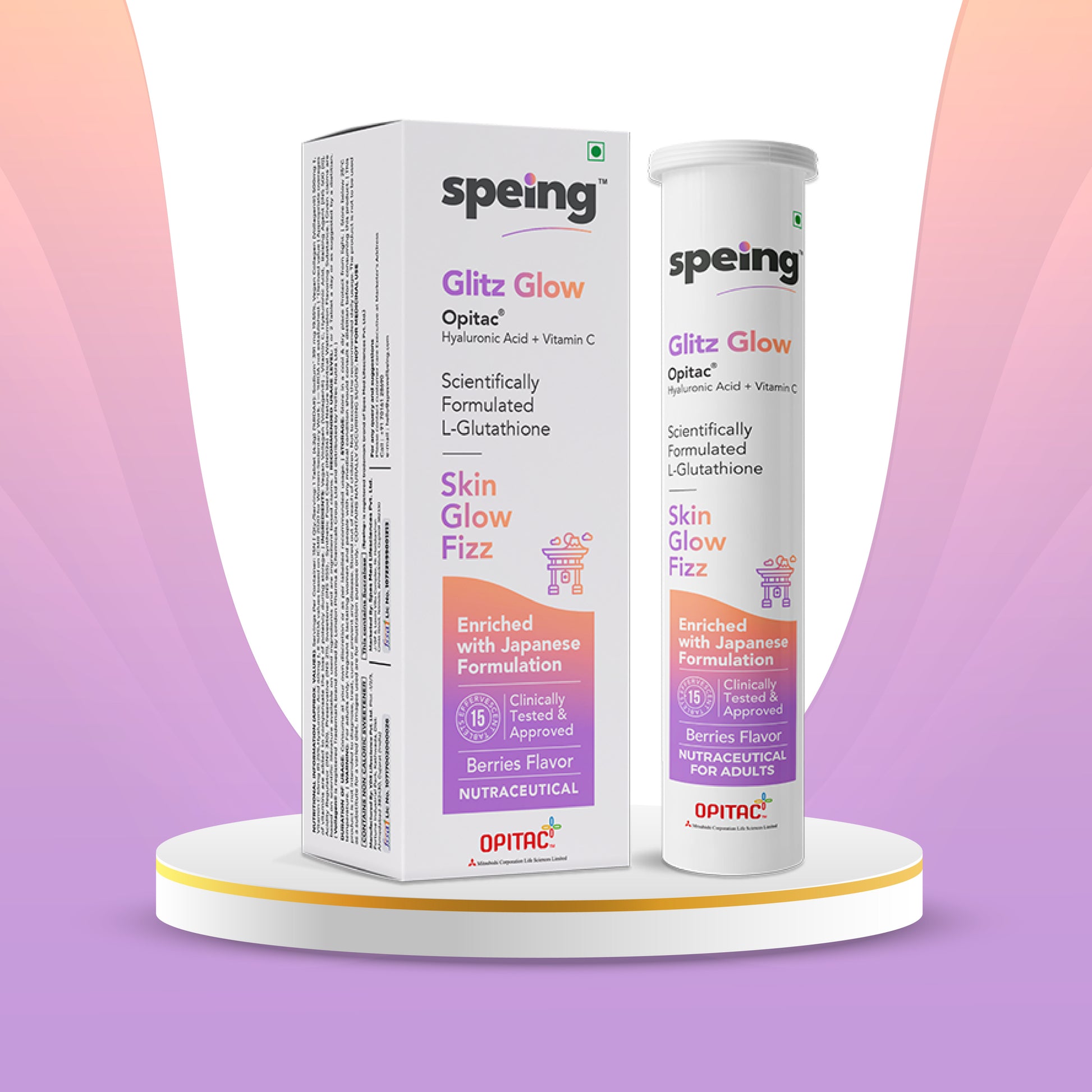 Speing Glitz Glow is a premium glutathione supplement designed to enhance skin radiance from within. It combines clinically proven Opitac® Glutathione with Hyaluronic Acid and Vitamin C to promote a brighter, more even complexion, reduce pigmentation, and protect against oxidative stress.